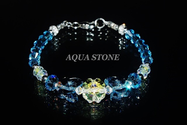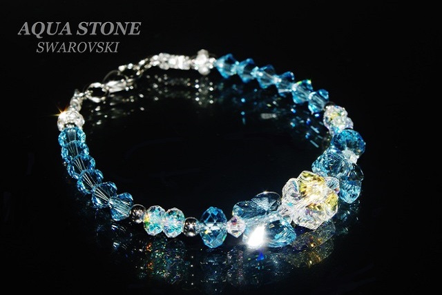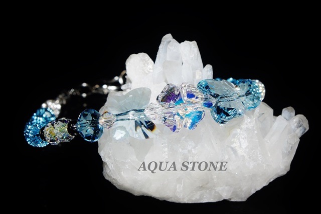素材 スワロフスキー・エレメント #5752 クリスタルAB / 12mmクローバー #5754 アクアマリン / 12mmバタフライ #5040 アクアマリン / 8mmブリオレットカットビーズ #5040 クリスタルAB / 6mmブリオレットカットビーズ #5301 アクアマリン / 6mmソロバン #5301 クリスタルAB / 4mmソロバン