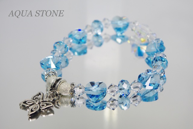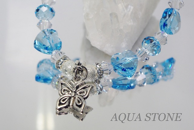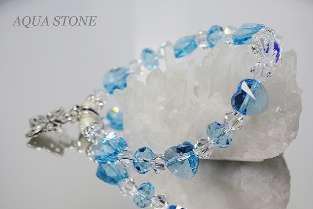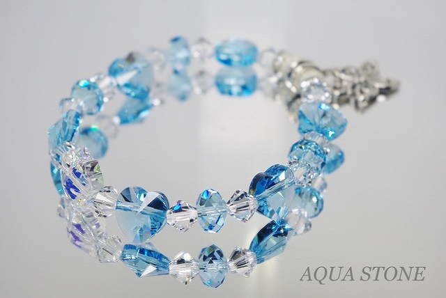 透明感のあるアクアマリンブルーのハートと、レインボークローバーのブレスレットです。
